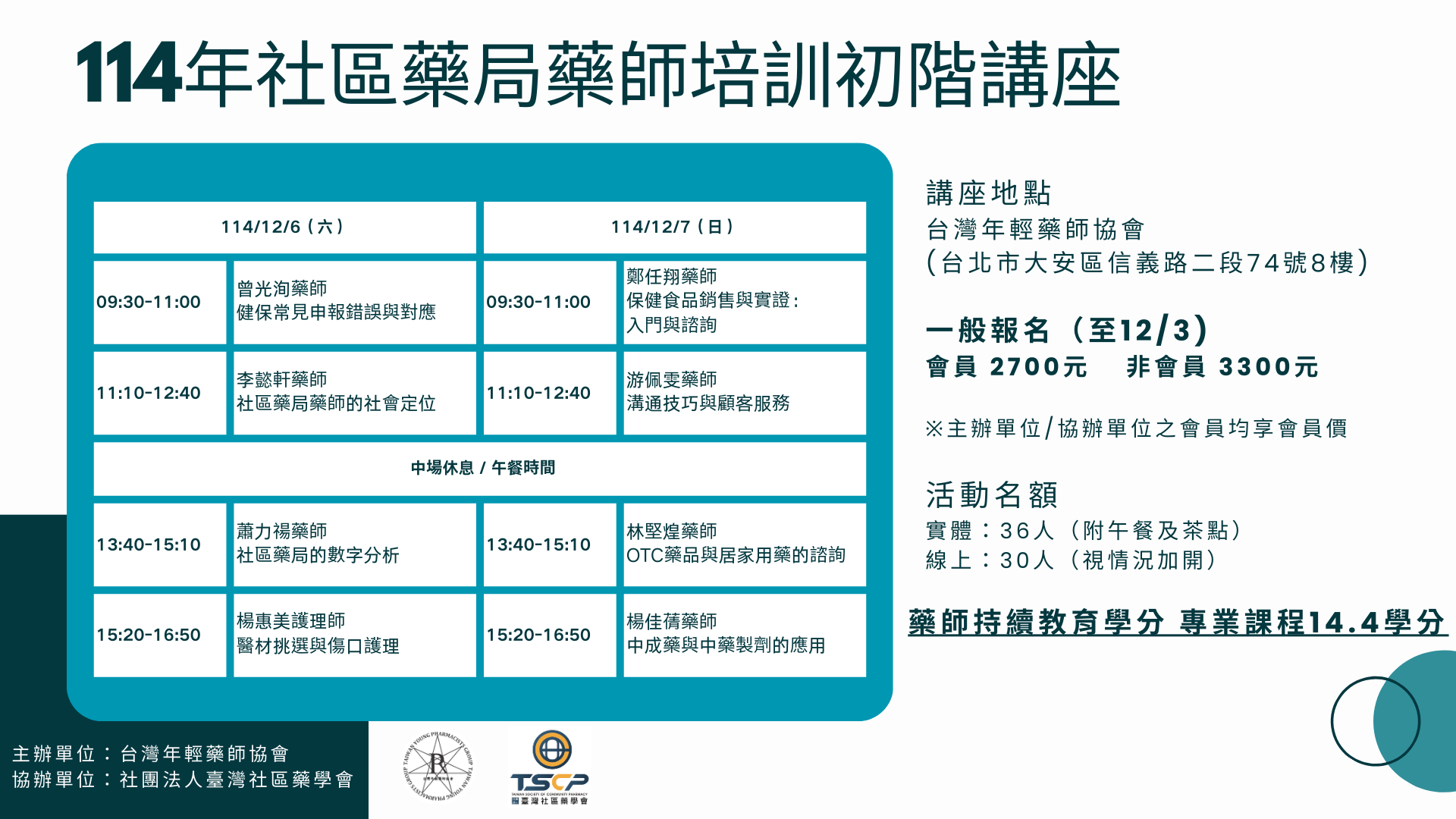 | 主辦 / 協辦 | 主辦:台灣年輕藥師協會 TYPG 協辦:社團法人臺灣社區藥學會 TSCP |